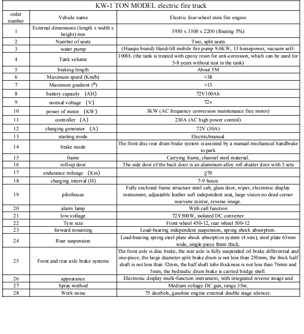 KW-1 tonnás modell elektromos tűzoltóautóEz a hagyományos tűzvédelmi rendszer fontos kiegészítése, különös tekintettel a kezdeti tűzoltásra, keskeny környezetre és a napi megelőzésre. Környezetbarát, gazdaságos és praktikus, és alkalmas a közösségek, festői helyek, ipari parkok és egyéb forgatókönyvek előléptetésére.